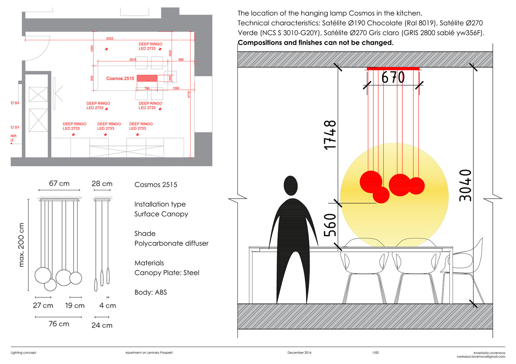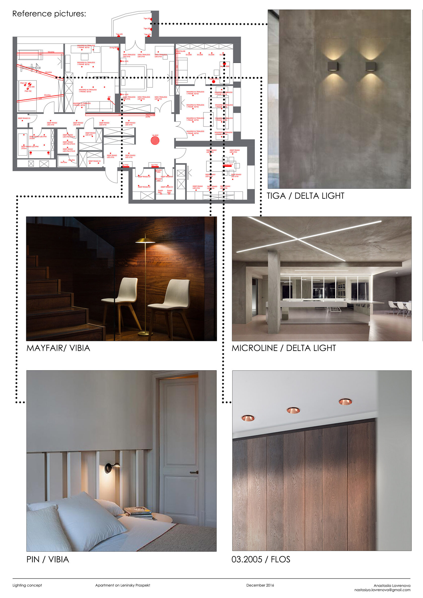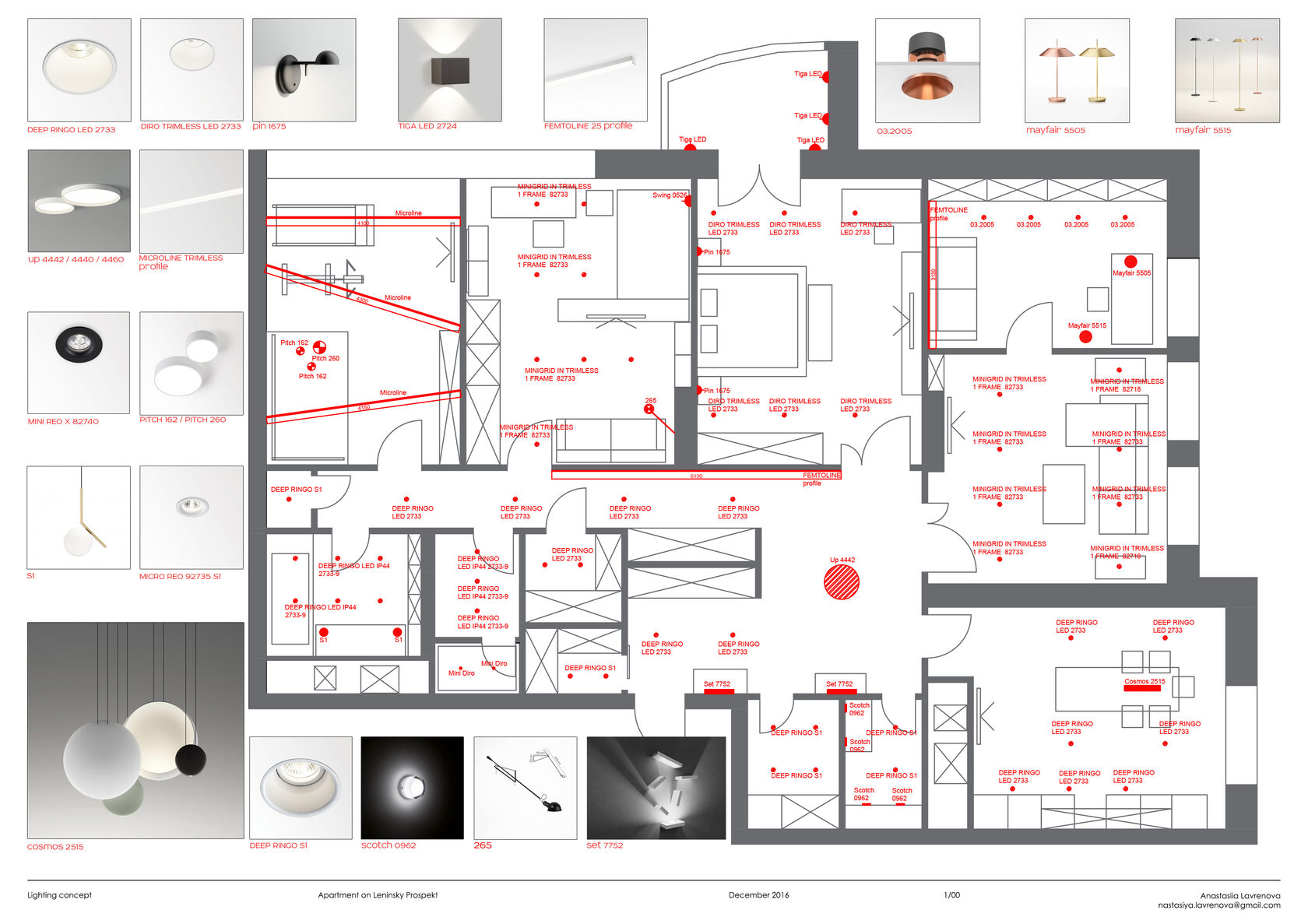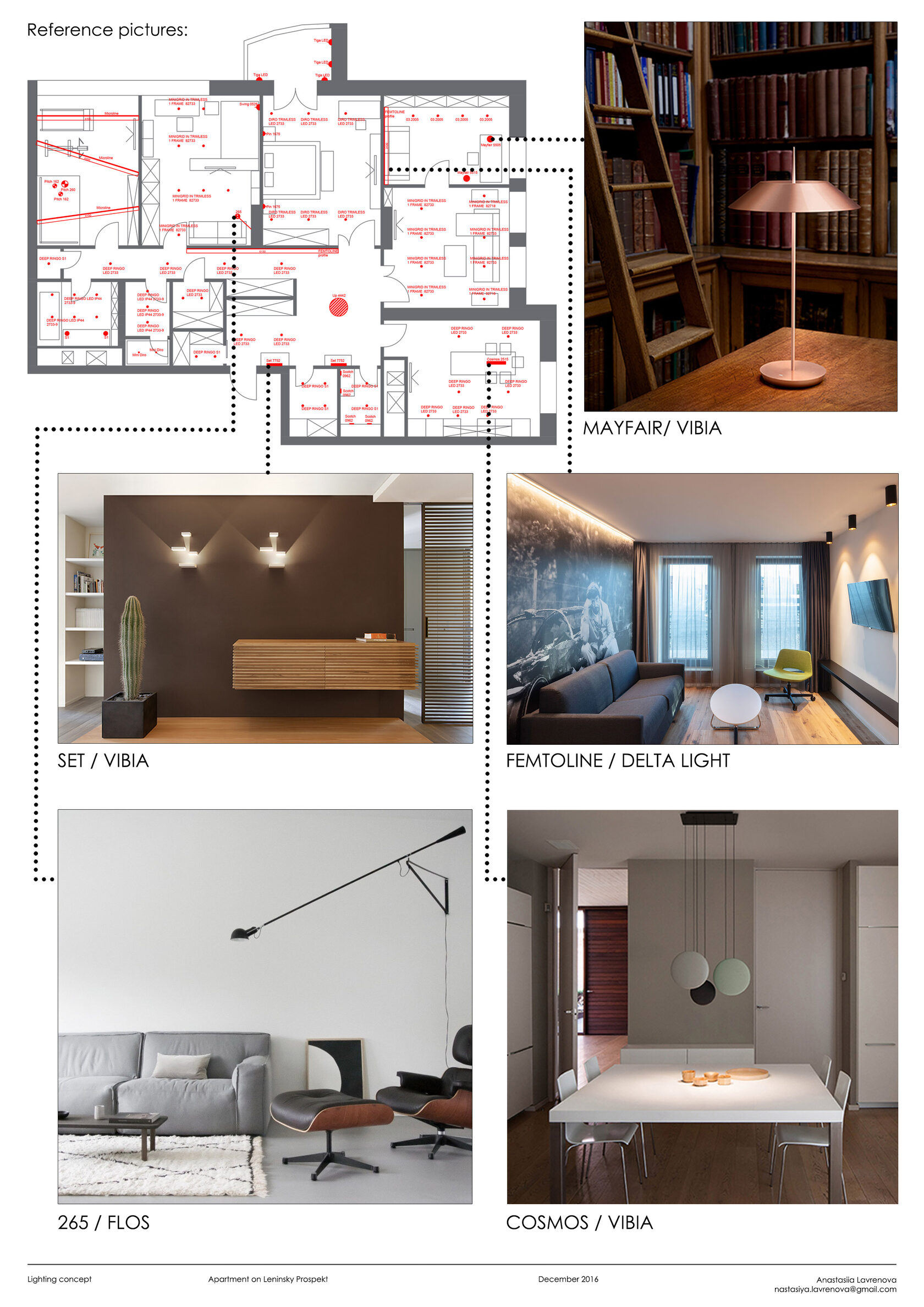 The design and visualizations of the apartment were still under development when I received the plans, so the main task was to develop, in addition to architectural light, a decorative one that would suit any color scheme and style of the premises. Vibia and Flos factories were used here as decorative lighting.