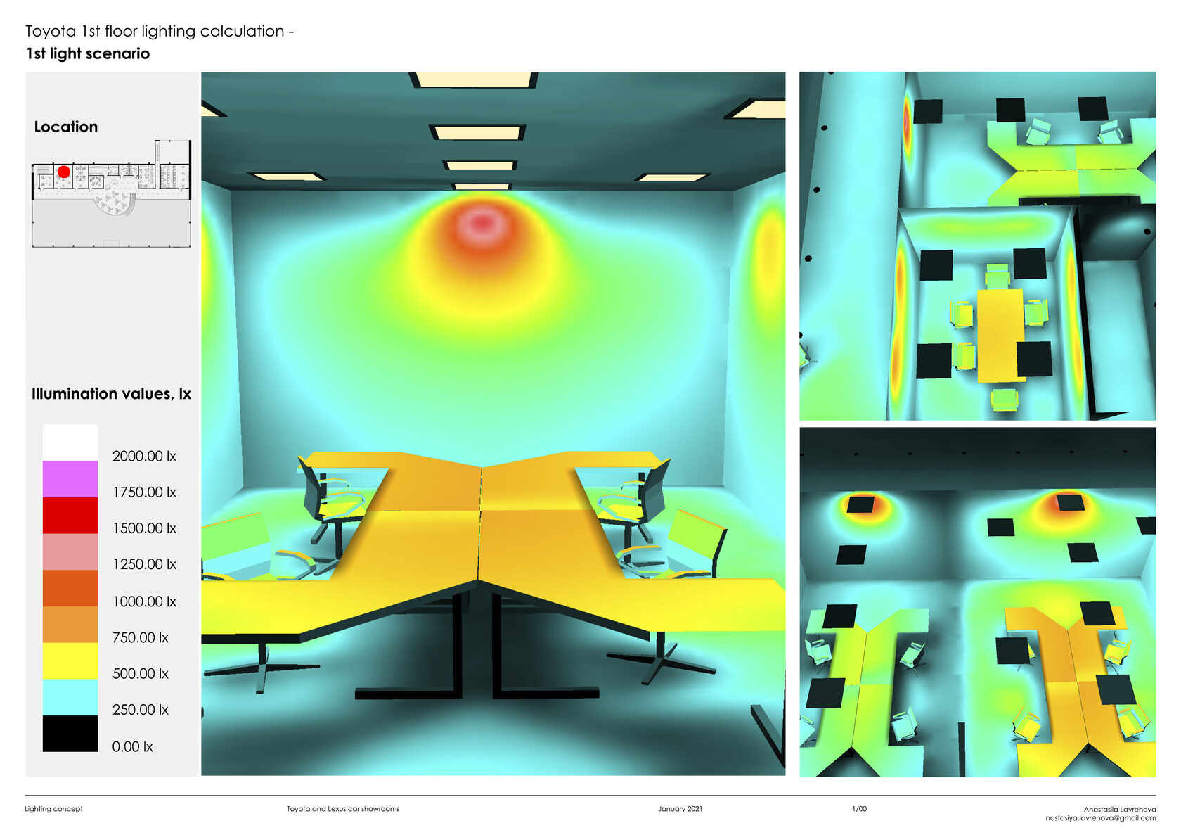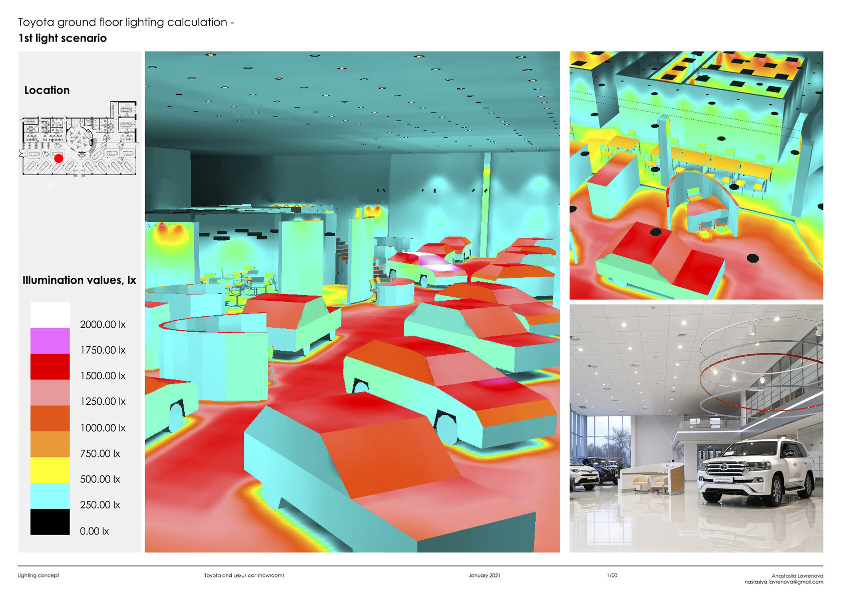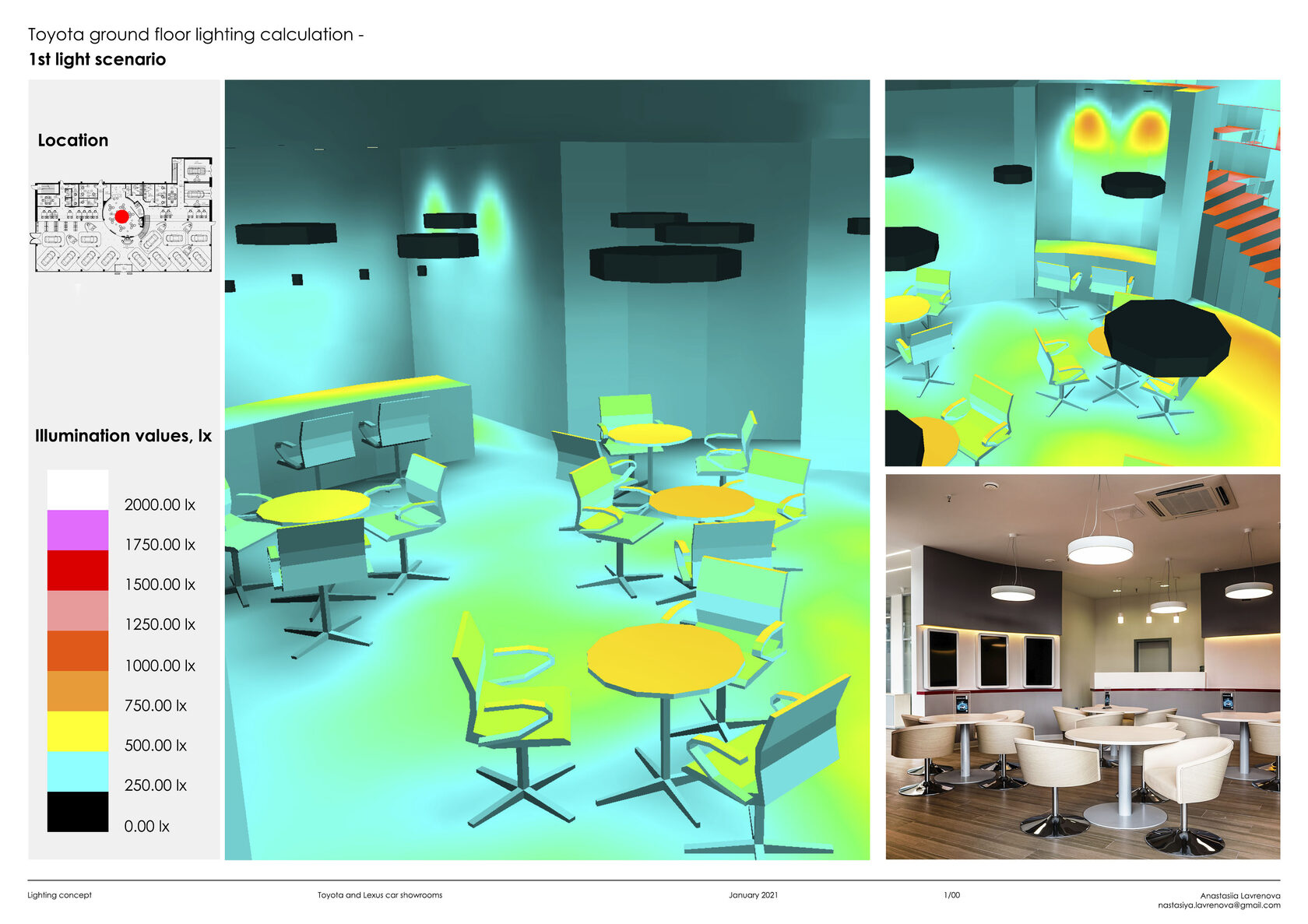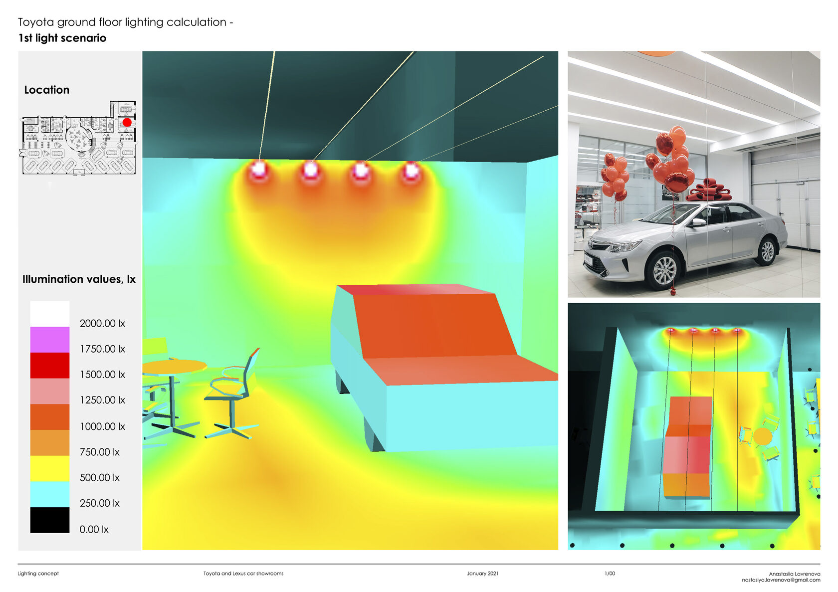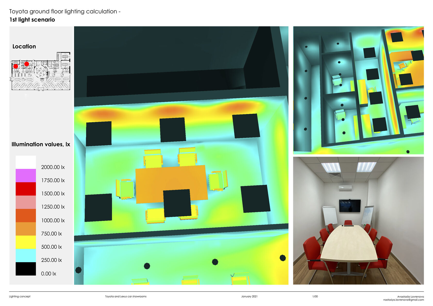 Предложения для автосалонов Toyota и Lexus – это один из самых масштабных проектов по световому дизайну, которые у меня были. Два объекта вместе занимают площадь около 4 тыс. квадратных метров. Самая важная информация, от которой я отталкивалась в этом проекте – это нужная освещенность, которая была прописана заказчиком заранее в ТЗ, так, например, в зонах, где стояли автомобили на уровне капотов должно было быть от 1500 до 2000 lx, в рабочих зонах на уровне 0.8 м (стола) 400 lx и т.д. и т.п. Здесь представлена лишь небольшая часть работы, за 3 месяца в общем было сделано около 10 вариантов расположения светового оборудования плюс к расчетам всегда прилагались различные таблицы – спецификации с кол-вом, мощностями, вариантами отделок и т.д.