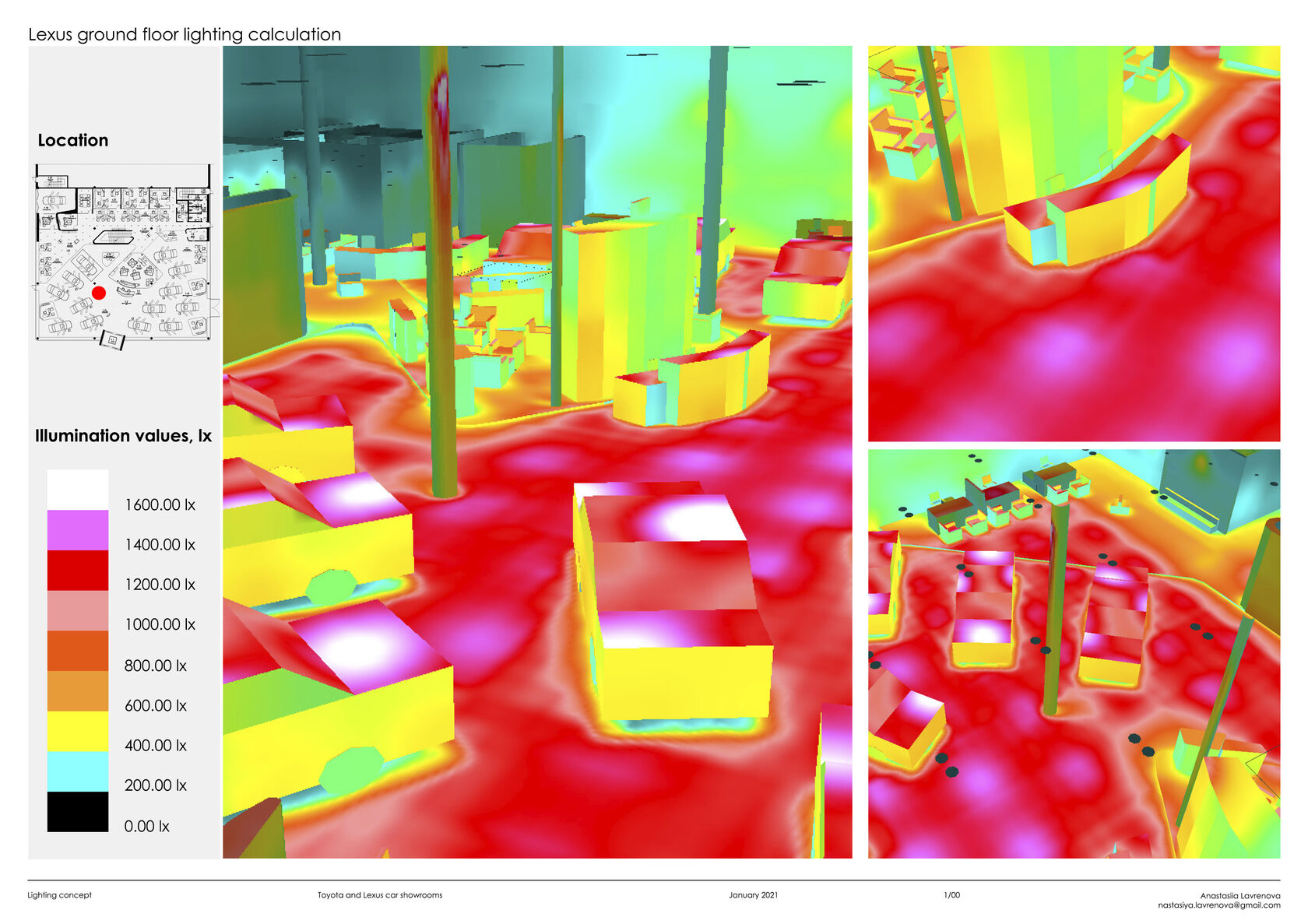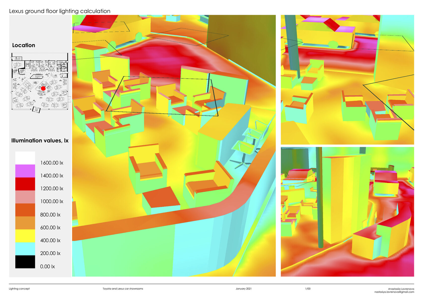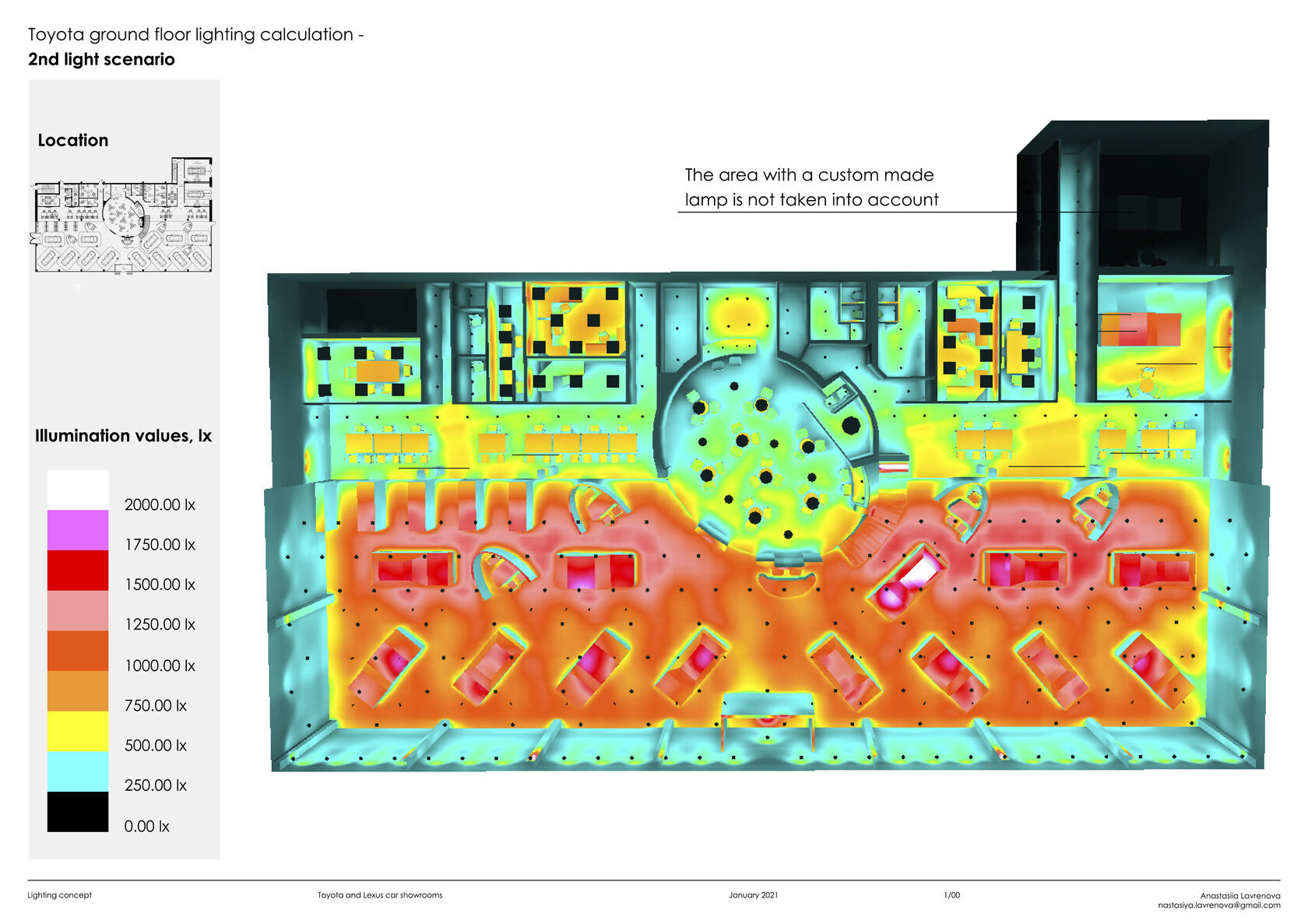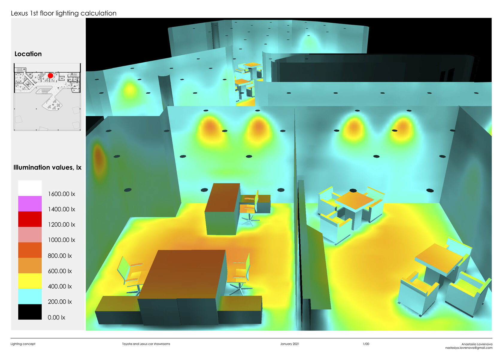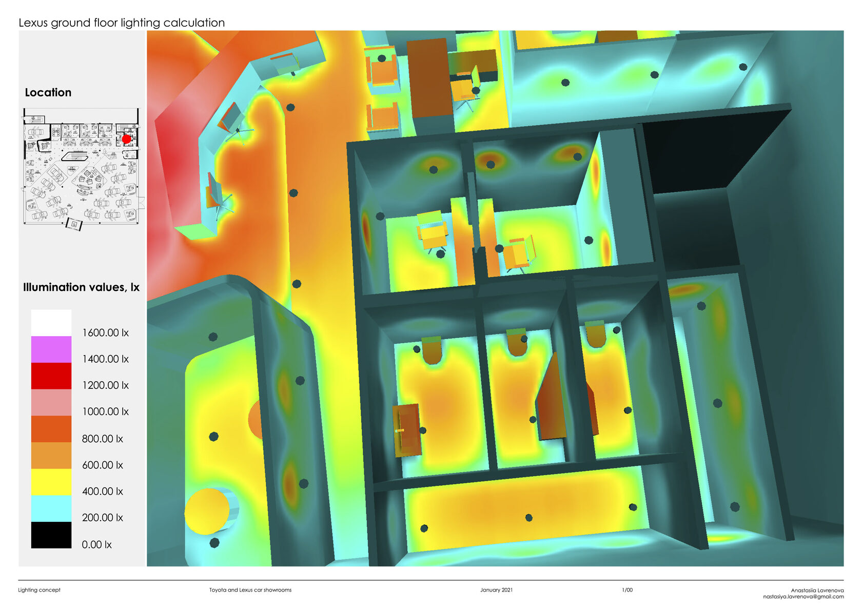 Предложения для автосалонов Toyota и Lexus – это один из самых масштабных проектов по световому дизайну, которые у меня были. Два объекта вместе занимают площадь около 4 тыс. квадратных метров. Самая важная информация, от которой я отталкивалась в этом проекте – это нужная освещенность, которая была прописана заказчиком заранее в ТЗ, так, например, в зонах, где стояли автомобили на уровне капотов должно было быть от 1500 до 2000 lx, в рабочих зонах на уровне 0.8 м (стола) 400 lx и т.д. и т.п. Здесь представлена лишь небольшая часть работы, за 3 месяца в общем было сделано около 10 вариантов расположения светового оборудования плюс к расчетам всегда прилагались различные таблицы – спецификации с кол-вом, мощностями, вариантами отделок и т.д.