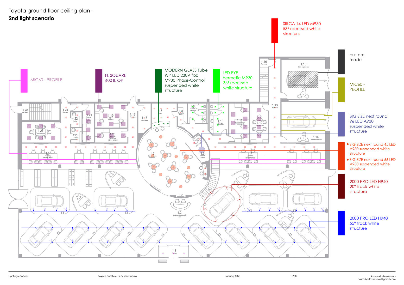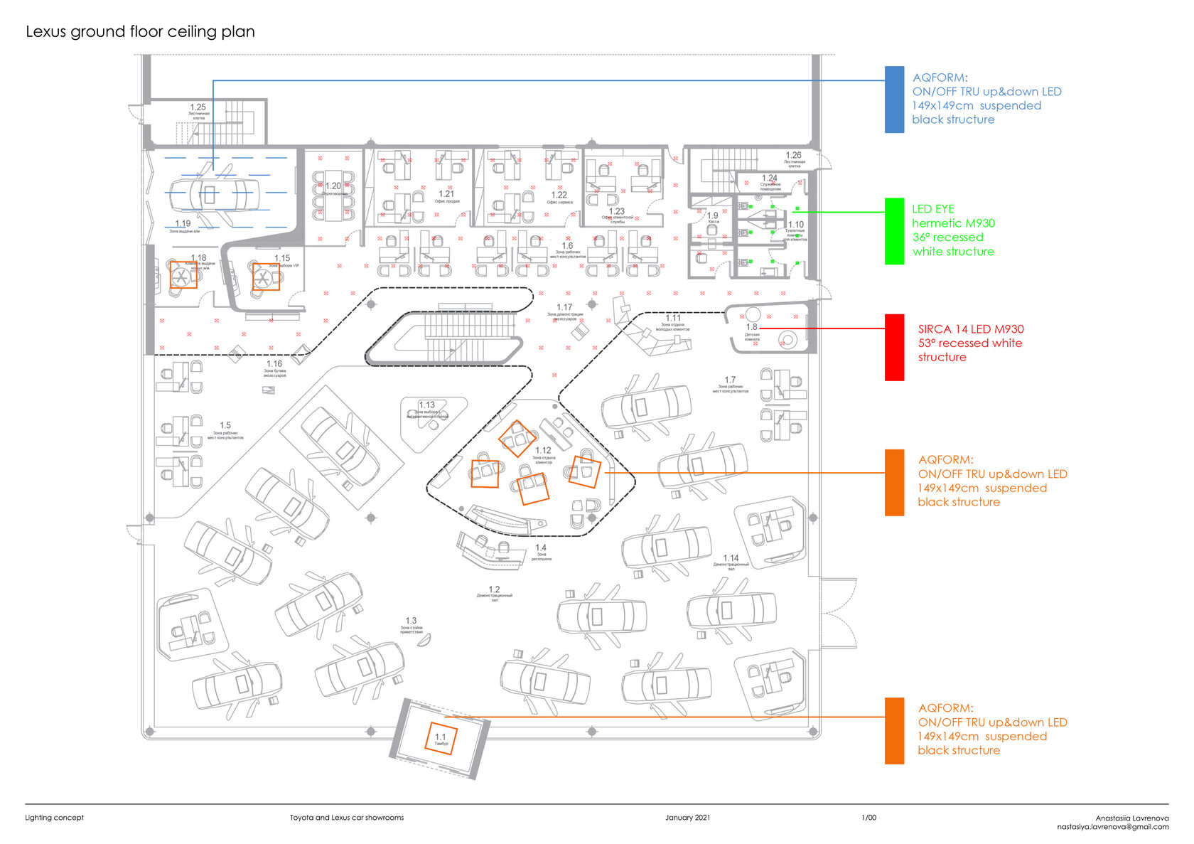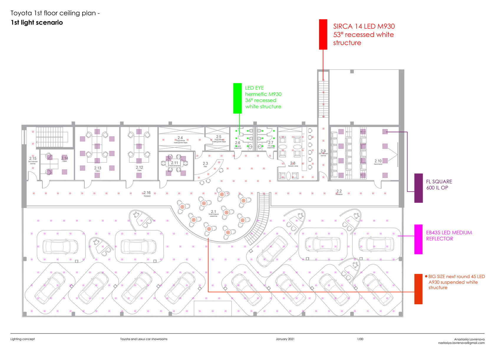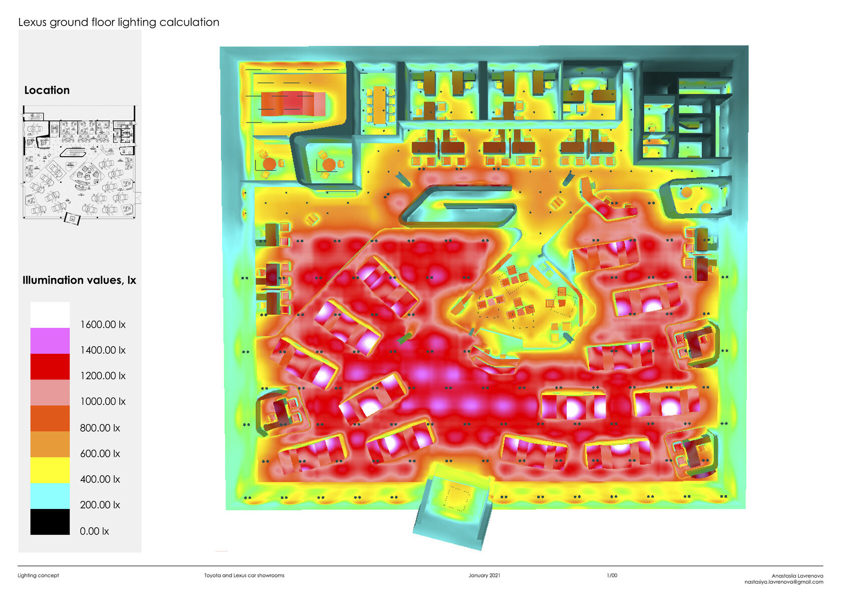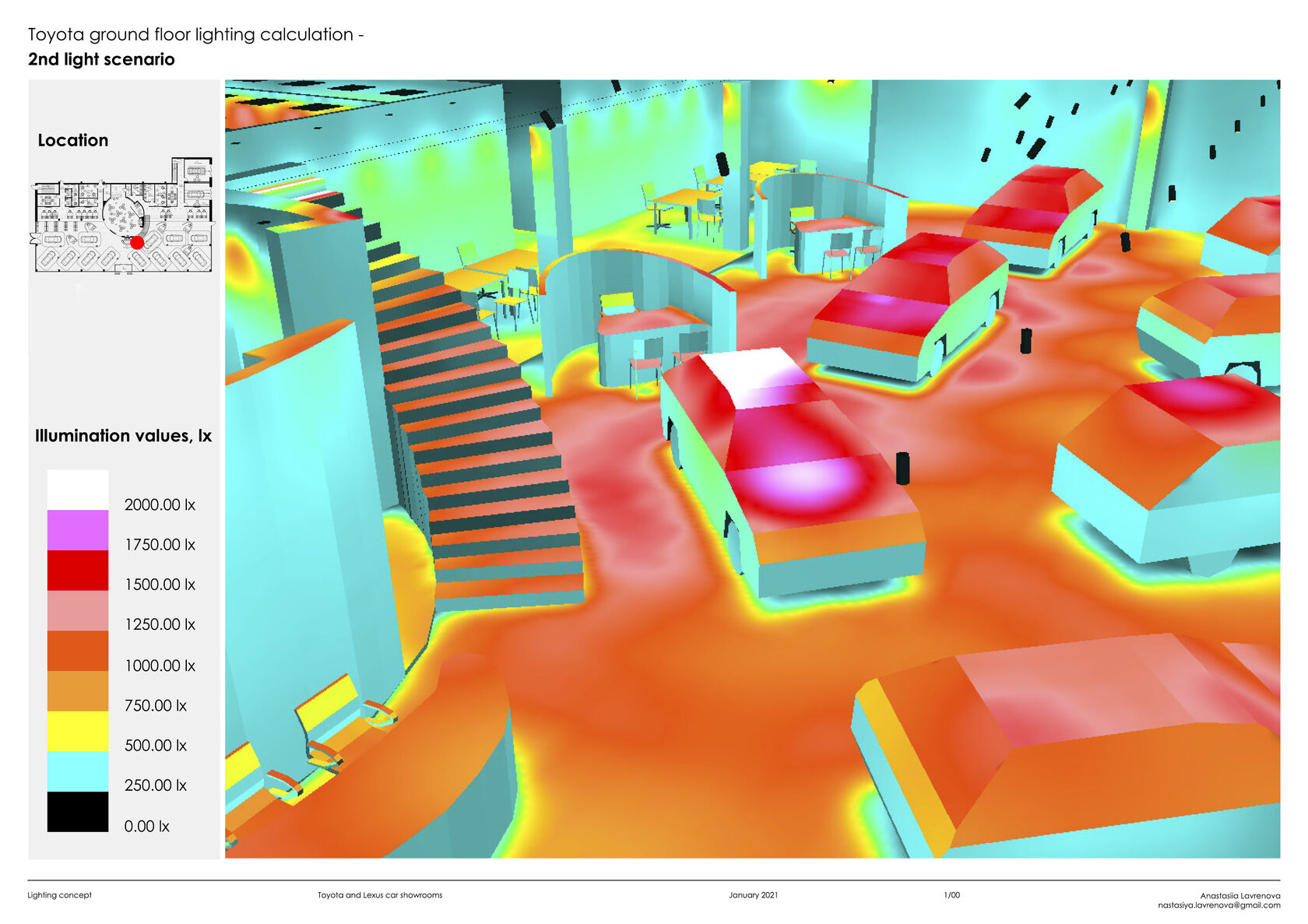 Предложения для автосалонов Toyota и Lexus – это один из самых масштабных проектов по световому дизайну, которые у меня были. Два объекта вместе занимают площадь около 4 тыс. квадратных метров. Самая важная информация, от которой я отталкивалась в этом проекте – это нужная освещенность, которая была прописана заказчиком заранее в ТЗ, так, например, в зонах, где стояли автомобили на уровне капотов должно было быть от 1500 до 2000 lx, в рабочих зонах на уровне 0.8 м (стола) 400 lx и т.д. и т.п. Здесь представлена лишь небольшая часть работы, за 3 месяца в общем было сделано около 10 вариантов расположения светового оборудования плюс к расчетам всегда прилагались различные таблицы – спецификации с кол-вом, мощностями, вариантами отделок и т.д.