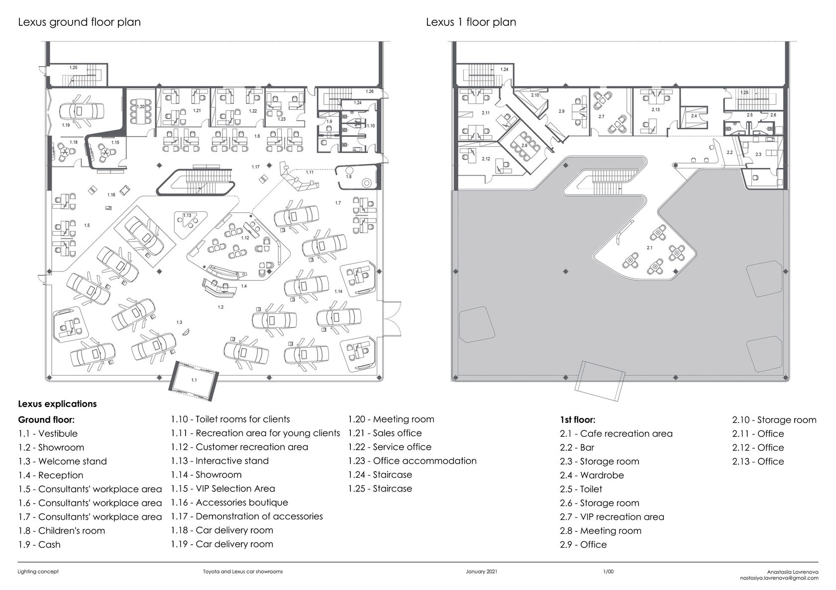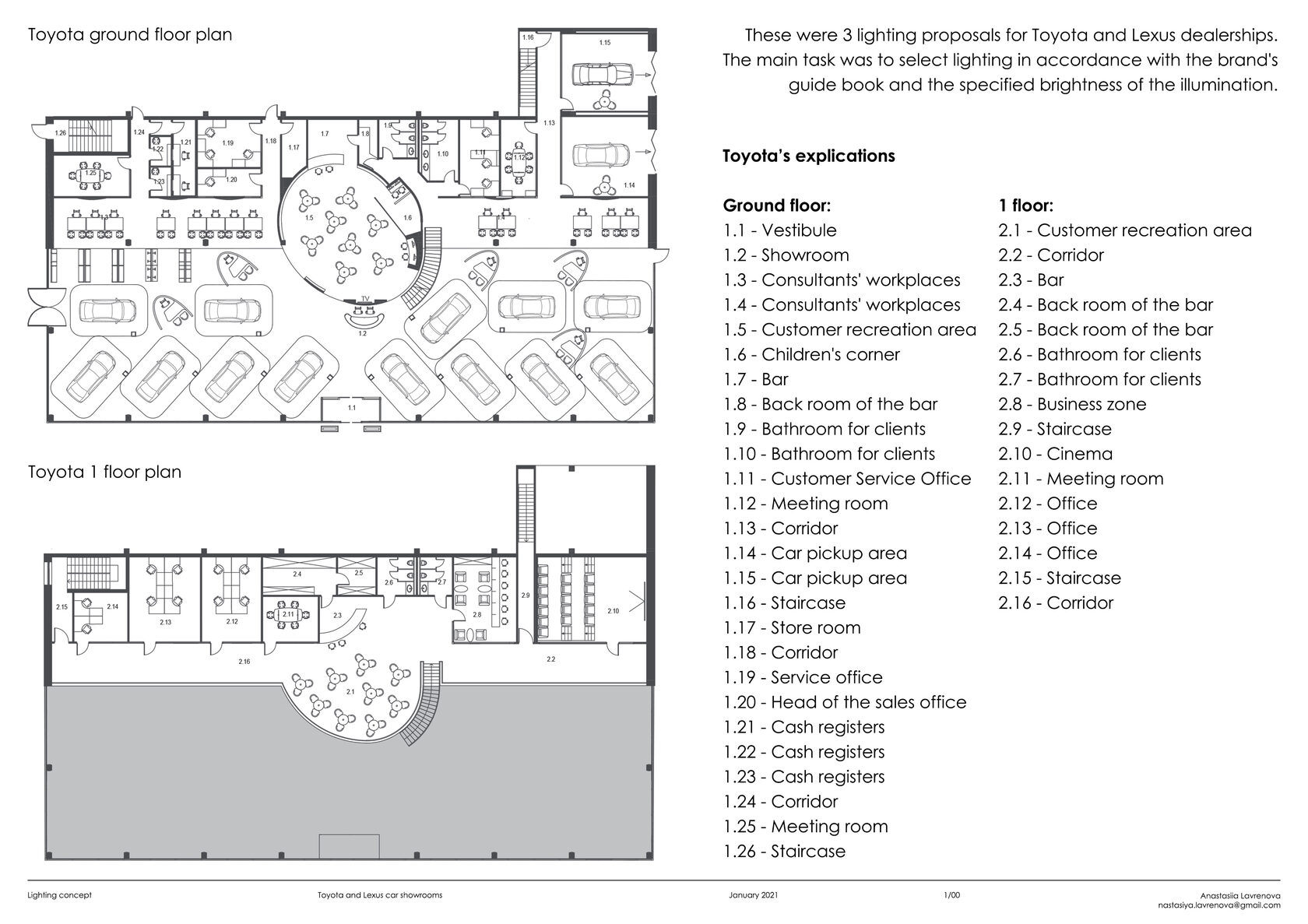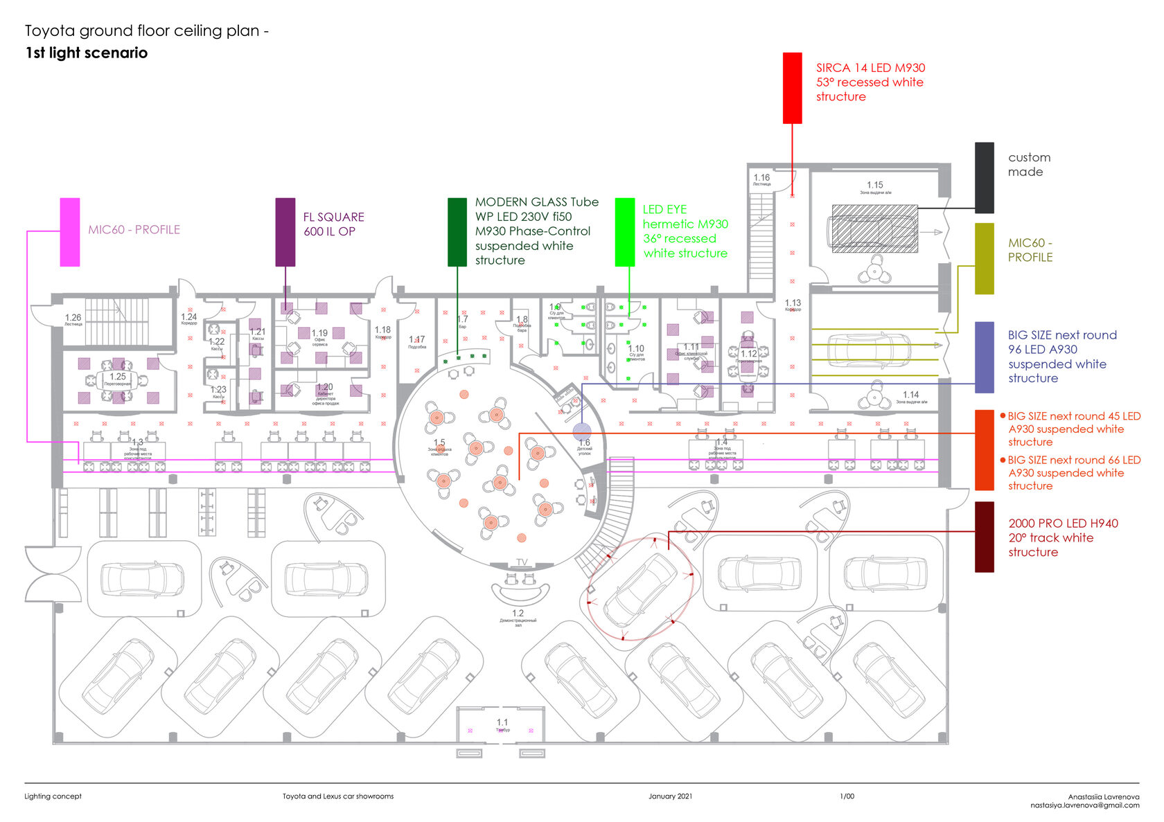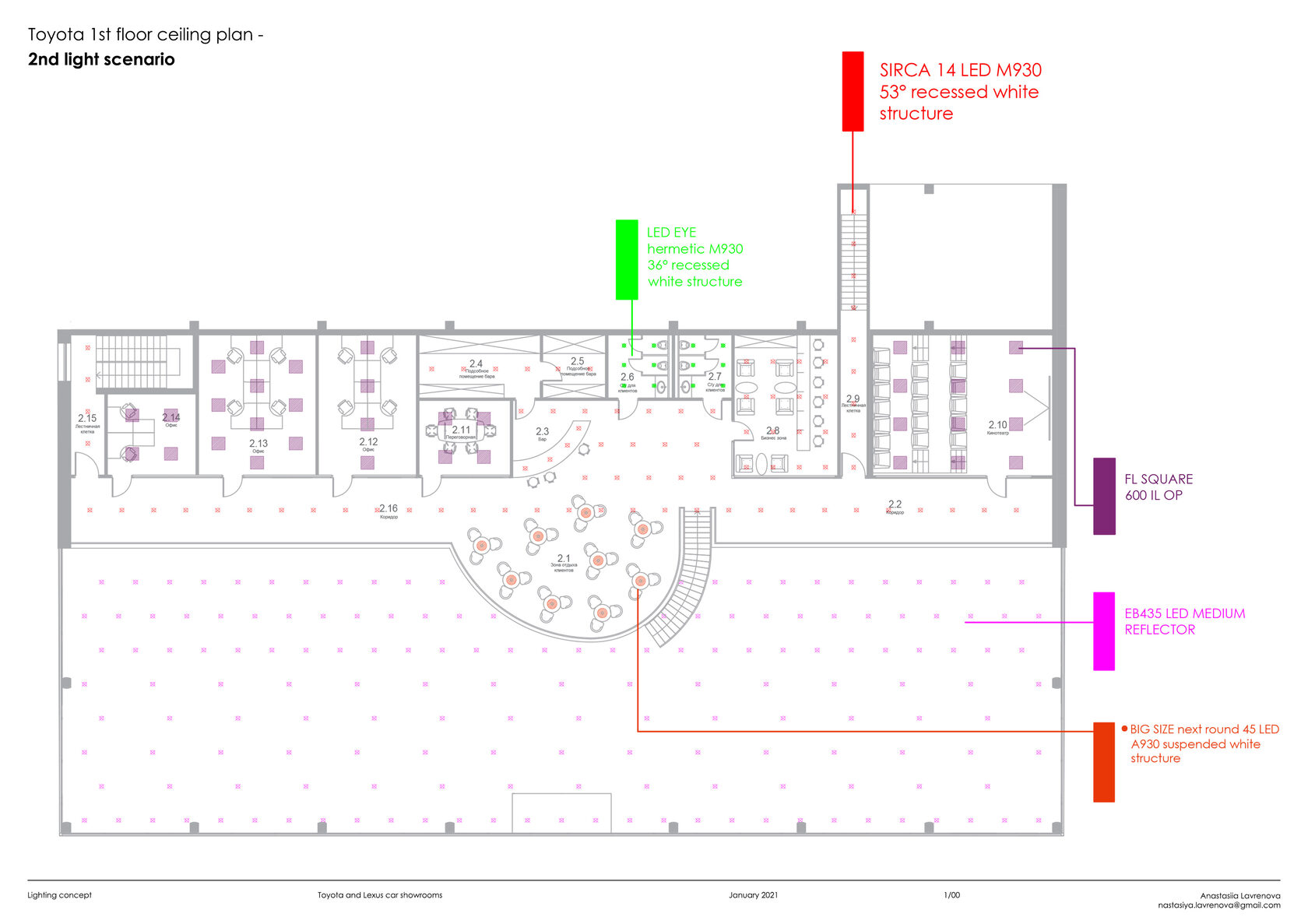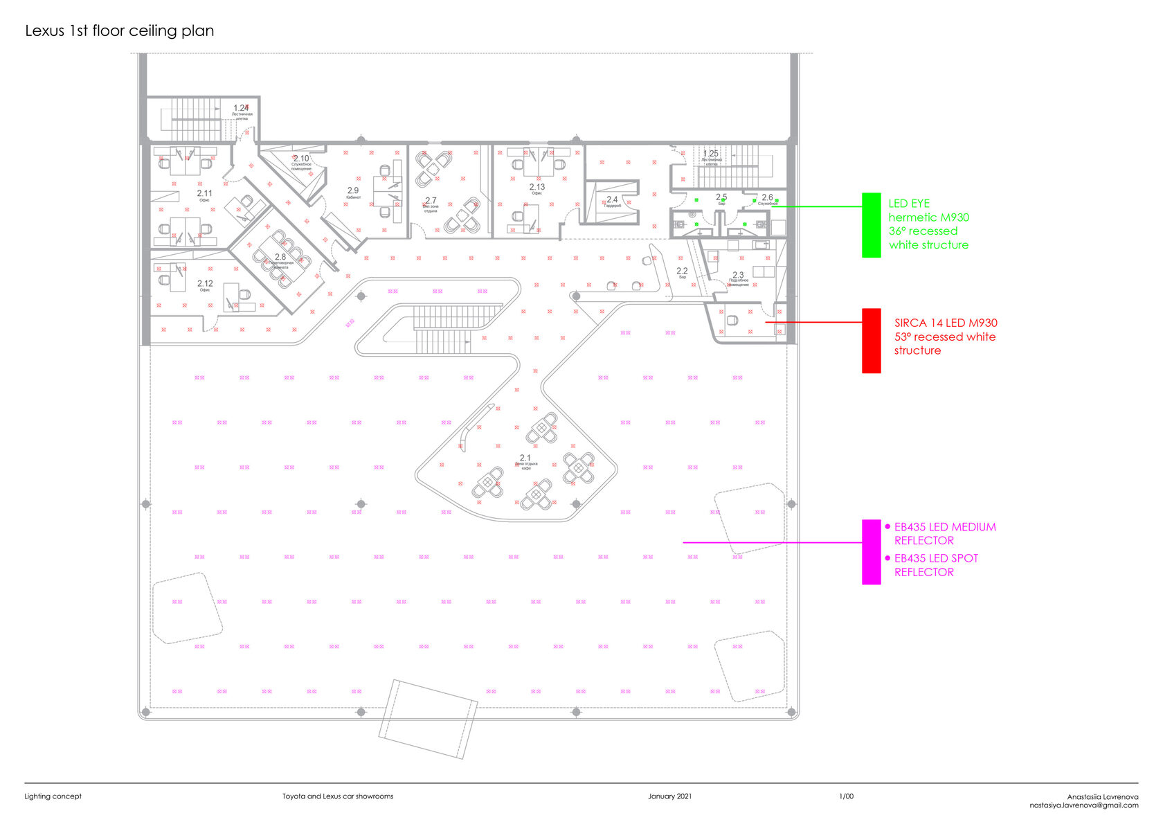 Предложения для автосалонов Toyota и Lexus – это один из самых масштабных проектов по световому дизайну, которые у меня были. Два объекта вместе занимают площадь около 4 тыс. квадратных метров. Самая важная информация, от которой я отталкивалась в этом проекте – это нужная освещенность, которая была прописана заказчиком заранее в ТЗ, так, например, в зонах, где стояли автомобили на уровне капотов должно было быть от 1500 до 2000 lx, в рабочих зонах на уровне 0.8 м (стола) 400 lx и т.д. и т.п. Здесь представлена лишь небольшая часть работы, за 3 месяца в общем было сделано около 10 вариантов расположения светового оборудования плюс к расчетам всегда прилагались различные таблицы – спецификации с кол-вом, мощностями, вариантами отделок и т.д.