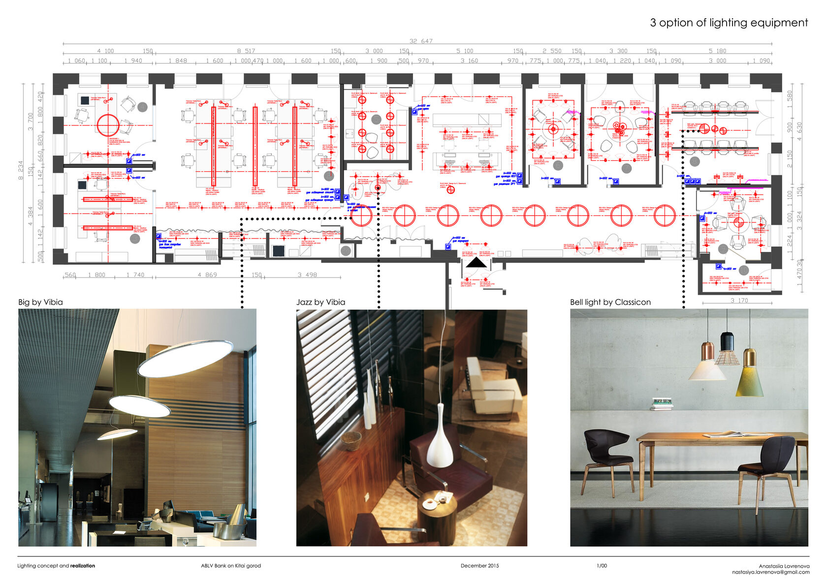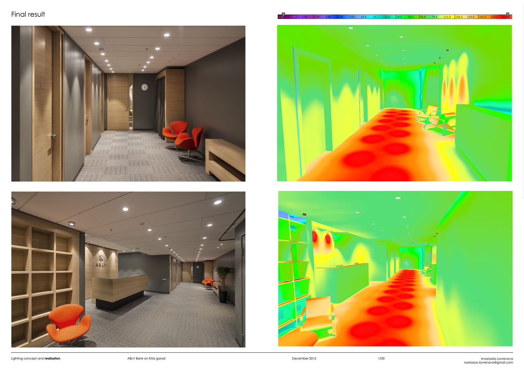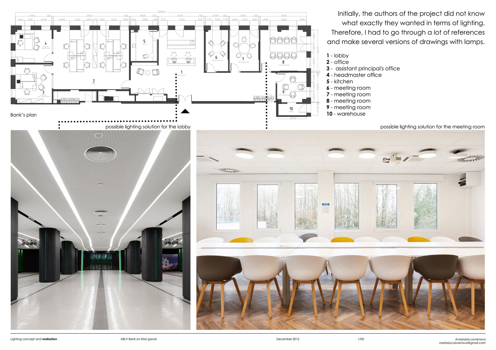 Работа над освещением этого банка была очень детальной и продолжительной. В ходе нее было разработано множество вариантов света и подобрано много референсов, часть из которых вы сможете увидеть ниже. В качестве финального результата был выбран более сдержанный вариант с точечным освещением в зоне лобби, который вы можете увидеть на светотехническом расчете, а также на фотографиях реализованного объекта.