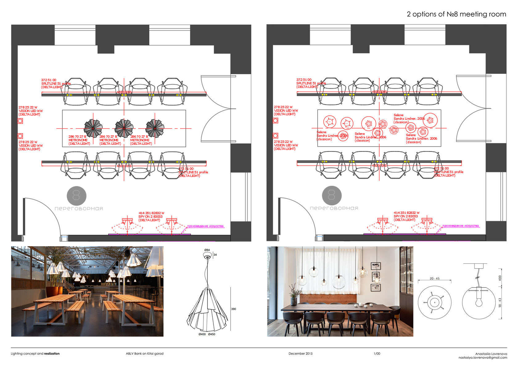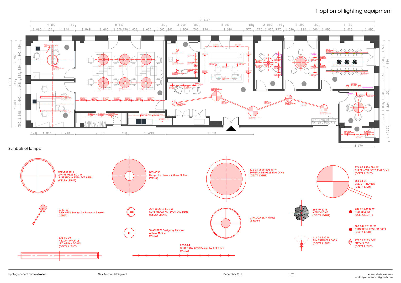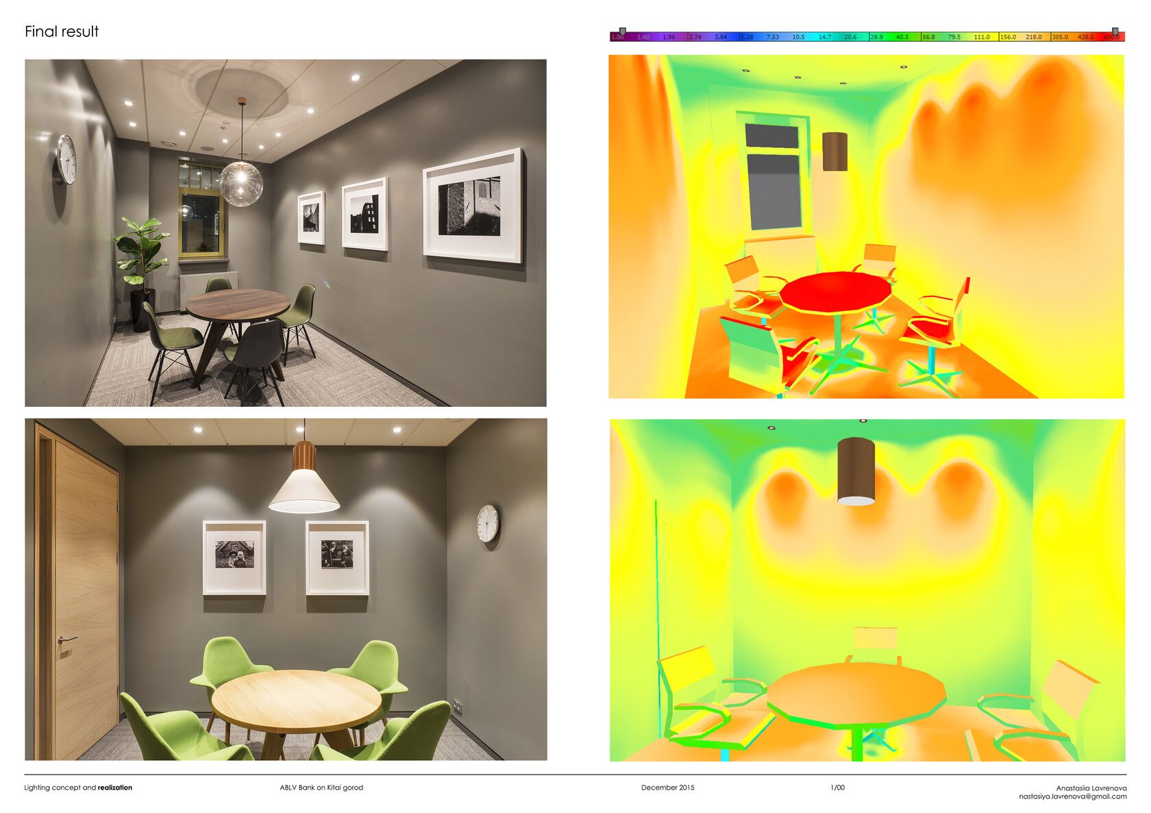Работа над освещением этого банка была очень детальной и продолжительной. В ходе нее было разработано множество вариантов света и подобрано много референсов, часть из которых вы сможете увидеть ниже. В качестве финального результата был выбран более сдержанный вариант с точечным освещением в зоне лобби, который вы можете увидеть на светотехническом расчете, а также на фотографиях реализованного объекта.